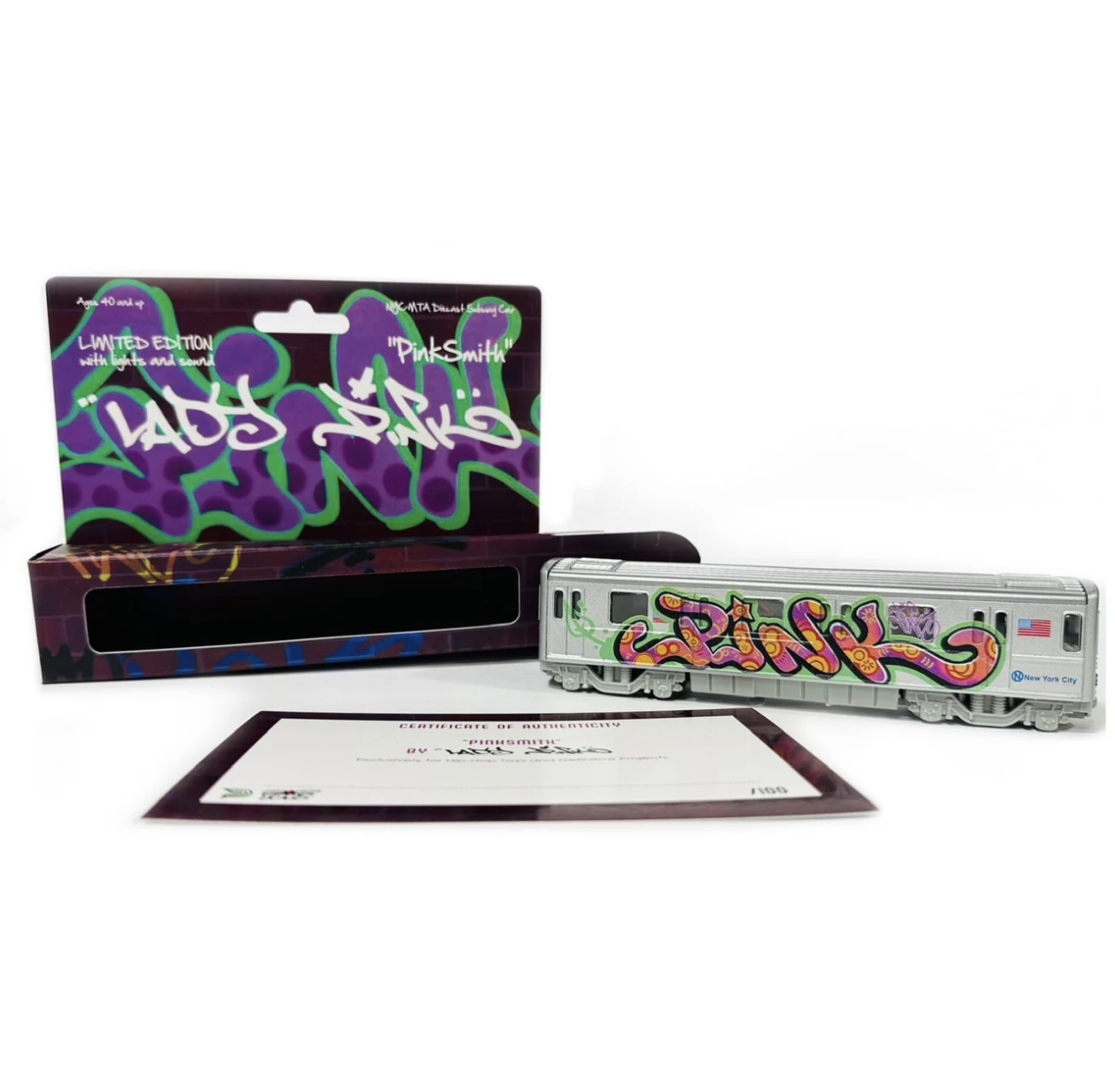 1:100 scale die-cast NYC MTA subway car featuring different artwork on each side of the train! The car has flashing lights and sounds and comes with a Certificate of Authenticity - hand signed by LADY PINK