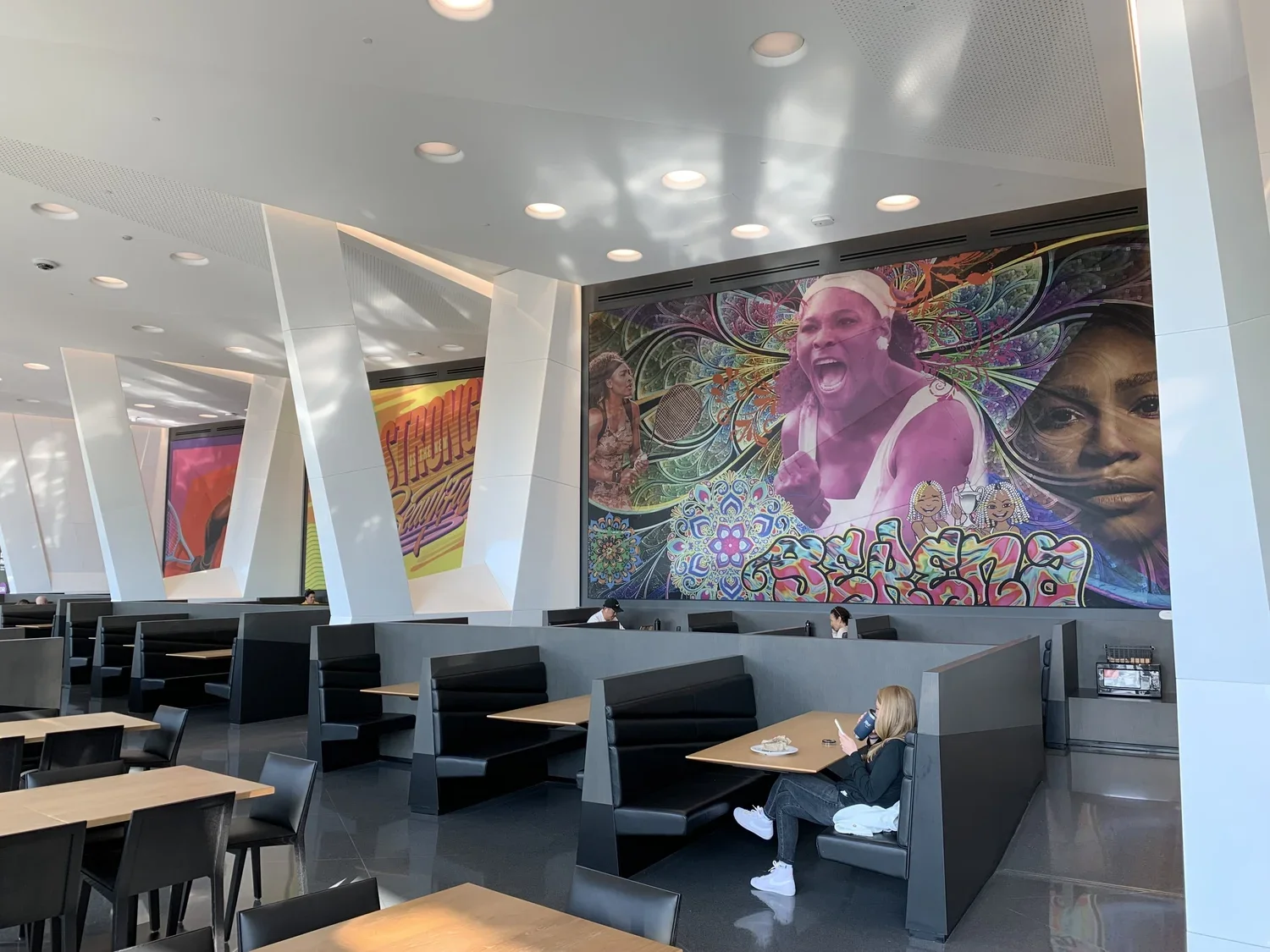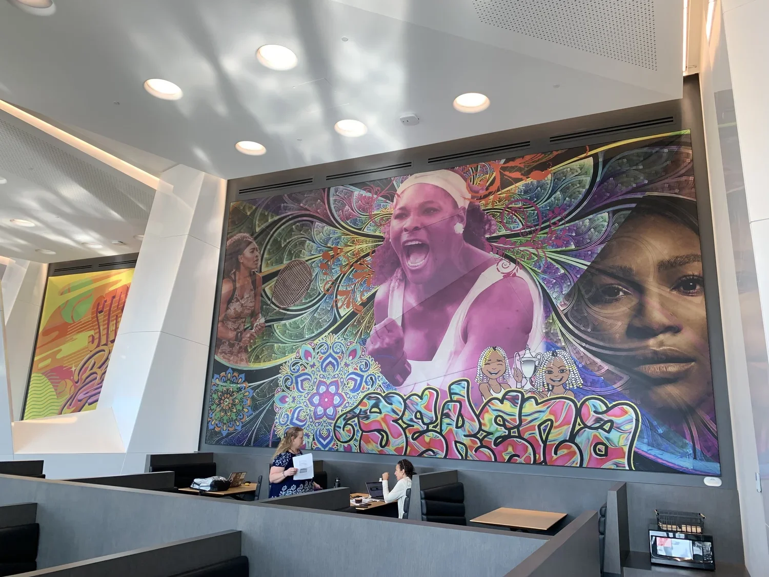 The U.S. Open Cafeteria at the Serena Williams Building features artwork from female artists such as Lady Pink, Queen Andrea, Alice Mizrachi, Sarah Rutherford, and Brittany Williams.